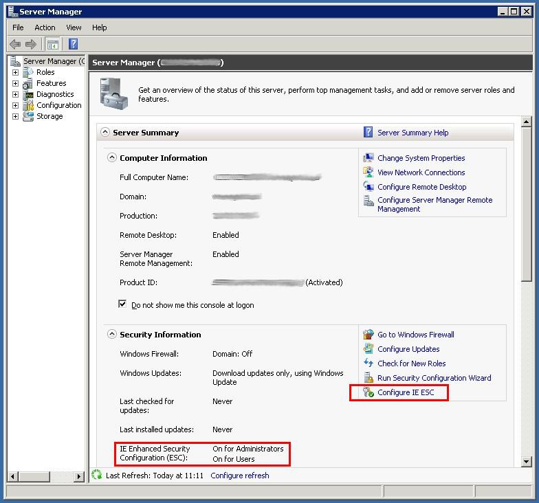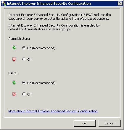 Another one to file in the "Yes, done that before, but I can't remember how" pile. Probably because it is so easy to do has some bearing on not being able to remember how... Anyway, here is how to disable Internet Explorer Enhanced Security Configuration (aka IE ESC) on Windows 2003 and 2008 Servers.