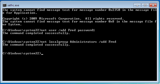 - Once command prompt opens (dont worry about any message text error messages), create new administrative account using: net user /add NEWUSER NEWPASSWORD
