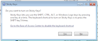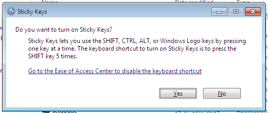 - At Windows logon prompt press shift key five times to launch stickykeys application sethc.exe (which we have replaced with cmd.exe):